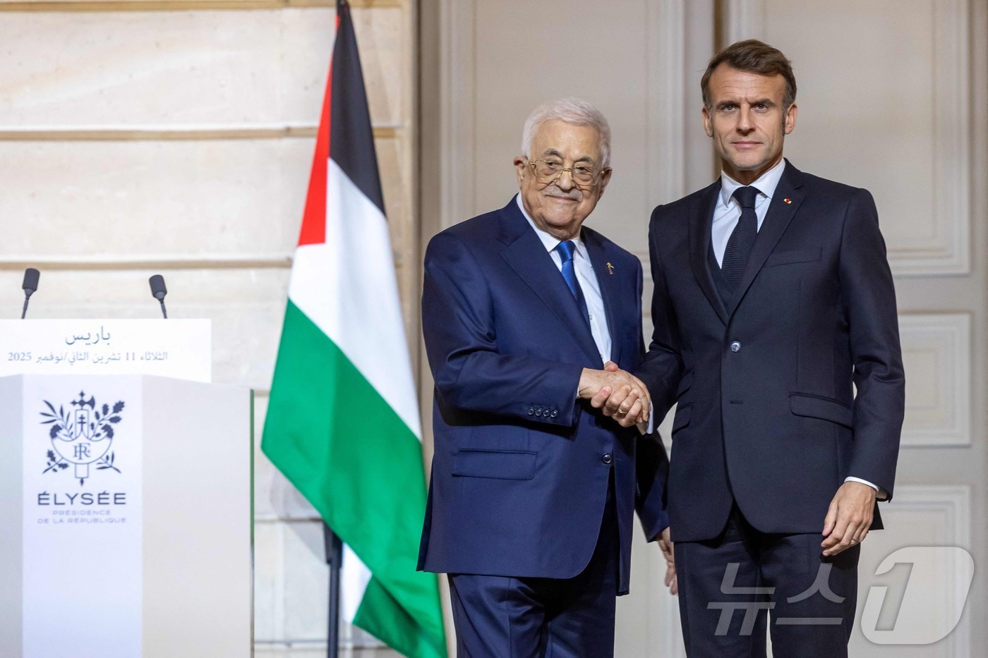 에마뉘엘 마크롱 프랑스 대통령이 11일(현지시간) 프랑스 파리 엘리제 대통령궁에서 마흐무드 아바스 팔레스타인 자치정부(PA) 수반과 공동 기자회견을 한 후 악수를 하고 있다. 2025.11.11./뉴스1 ⓒ AFP=뉴스1 ⓒ News1 이창규 기자 |