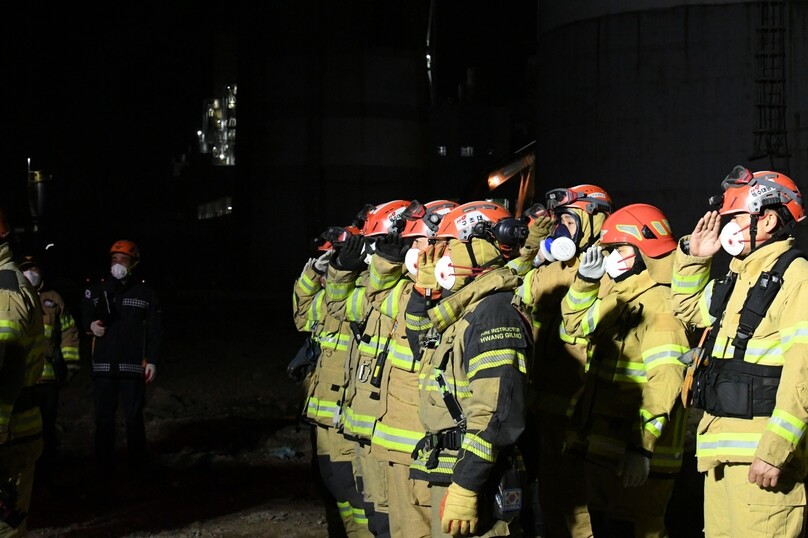 소방 구조대원들이 12일 새벽 울산화력발전소 보일러 타워 붕괴 사고 현장에서 주검을 수습한 뒤 거수경례를 하고 있다. 울산소방본부 제공 |