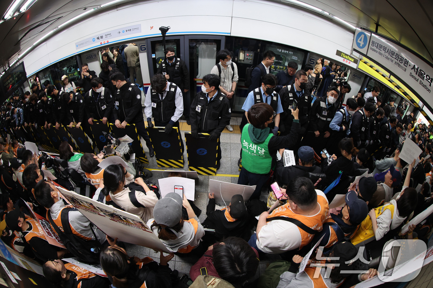 (서울=뉴스1) 이비슬 권혜정 기자 = 12일 오전 전국장애인차별철폐연대(전장연)가 서울 지하철 4호선 한성대입구역에서 벌인 시위로 지하철이 1시간가량 무정차 통과했다.