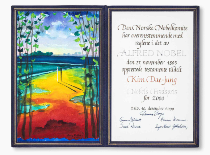 '김대중 대통령 노벨평화상 메달 및 증서'는 김대중 대통령이 한국과 동아시아 민주주의와 인권 신장, 특히 남북 평화와 화해를 위해 노력한 업적을 인정받아 2000년 한국인 최초로 수상한 노벨평화상 메달과 증서로 역사적 가치가 높다.