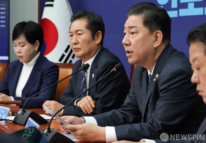 [서울=뉴스핌] 윤창빈 기자 = 김병기 더불어민주당 원내대표가 12일 서울 여의도 국회에서 열린 최고위원회의에서 모두발언을 하고 있다. 2025.11.12 pangbin@newspim.com