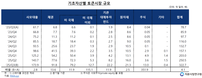 RWA(실물자산) 토큰 시장 규모(스테이블코인 제외)가 지난 2023년 3분기 78.7억달러에서 올해 3분기 322.7억달러로 4.1배 급증했다. 특히 채권, 주식 등 전통자산 토큰화가 가파른 성장세를 이끌고 있다. [자료=자본시장연구원] |