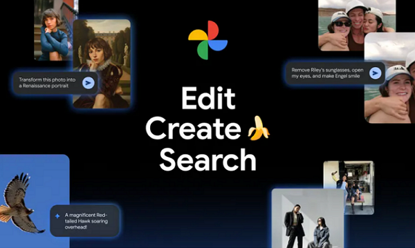 또한 구글의 AI 이미지 편집기 나노 바나나(Nano Banana)가 구글 포토에 통합되며, 사용자는 사진을 르네상스 그림이나 모자이크 스타일로 변환하는 등 창의적인 편집을 할 수 있다. 크리에이트 위드 AI(Create with AI) 섹션을 통해 인기 스타일을 반영한 템플릿을 제공하며, 향후 개인의 취향에 맞춘 맞춤형 템플릿도 추가될 예정이다.