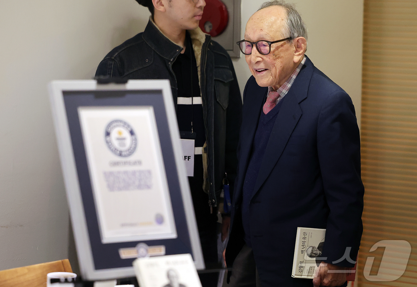 (서울=뉴스1) 김진환 기자 = 김형석 연세대학교 명예교수가 12일 오전 서울 중구 달개비에서 열린 '백 년의 유산' 출간 기자간담회에 참석하고 있다. '백 년의 유산'은 지난해 9월 기네스 기록까지 인증 받으며 세계 최고령 저자 타이틀을 거머쥔 김 교수의 신간으로 책 이성의 시대에 남겨진 마지막 철학자'가 무너져가는 인간성 회복을 위한 선언문이다. 철학, 종교, 삶과 죽음, 그리고 사회와 공동체를 아우르는 100여 년의 사유를 담고 있다. 2025.11.12/뉴스1