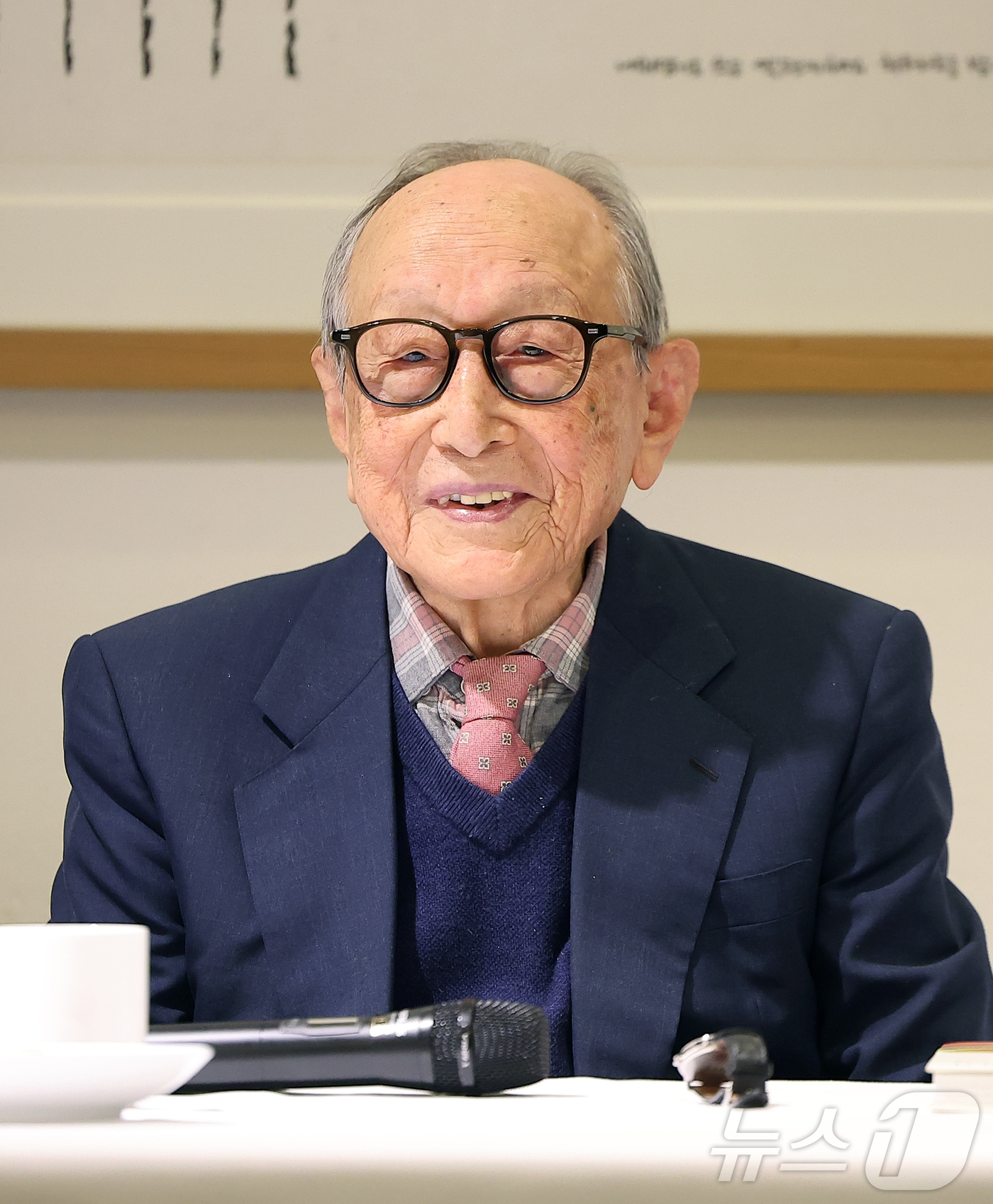 (서울=뉴스1) 김진환 기자 = 김형석 연세대학교 명예교수가 12일 오전 서울 중구 달개비에서 열린 '백 년의 유산' 출간 기자간담회에서 미소를 짓고 있다. '백 년의 유산'은 지난해 9월 기네스 기록까지 인증 받으며 세계 최고령 저자 타이틀을 거머쥔 김 교수의 신간으로 책 이성의 시대에 남겨진 마지막 철학자'가 무너져가는 인간성 회복을 위한 선언문이다. 철학, 종교, 삶과 죽음, 그리고 사회와 공동체를 아우르는 100여 년의 사유를 담고 있다. 2025.11.12/뉴스1