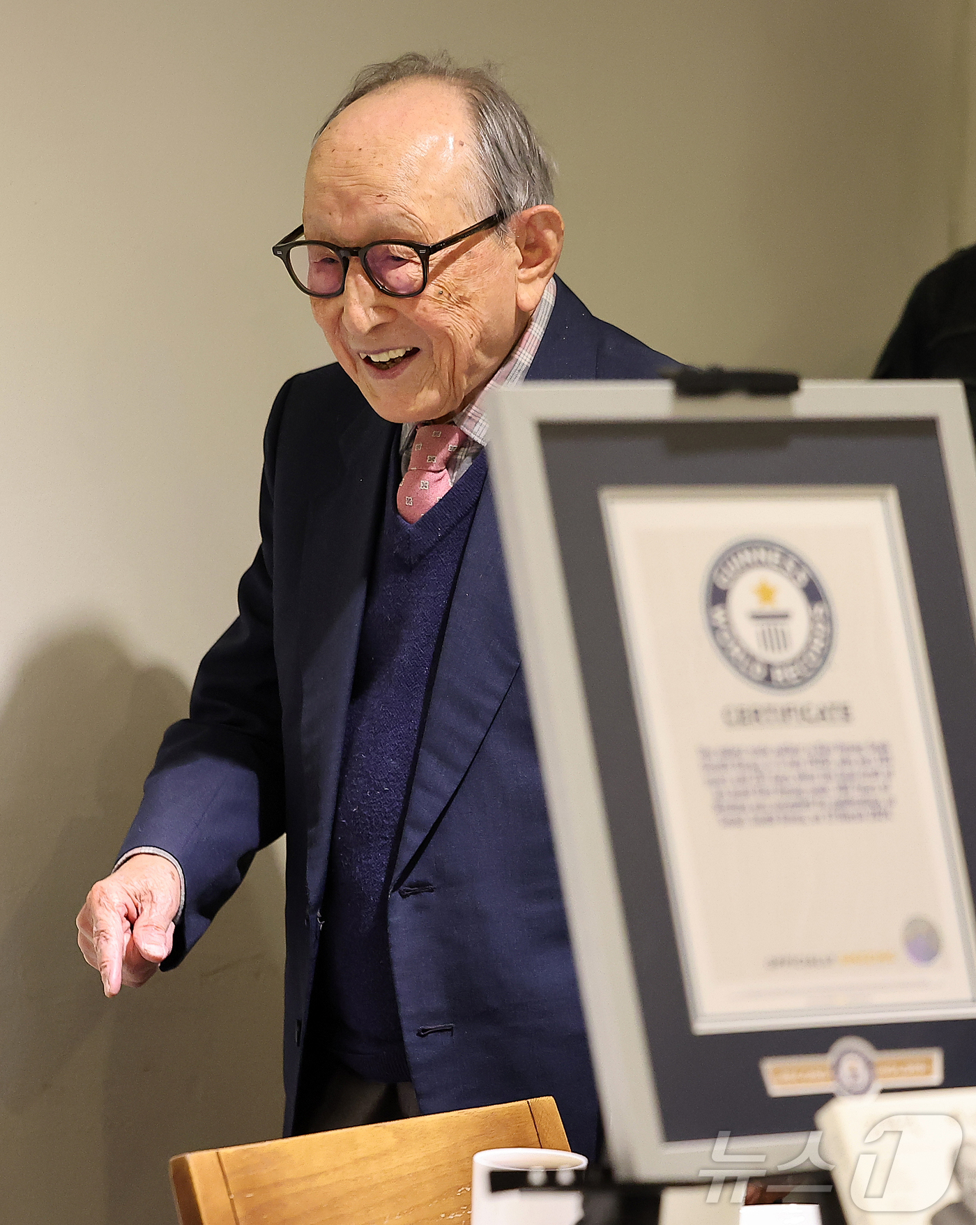 (서울=뉴스1) 김진환 기자 = 김형석 연세대학교 명예교수가 12일 오전 서울 중구 달개비에서 열린 '백 년의 유산' 출간 기자간담회에 참석하고 있다. '백 년의 유산'은 지난해 9월 기네스 기록까지 인증 받으며 세계 최고령 저자 타이틀을 거머쥔 김 교수의 신간으로 책 이성의 시대에 남겨진 마지막 철학자'가 무너져가는 인간성 회복을 위한 선언문이다. 철학, 종교, 삶과 죽음, 그리고 사회와 공동체를 아우르는 100여 년의 사유를 담고 있다. 2025.11.12/뉴스1