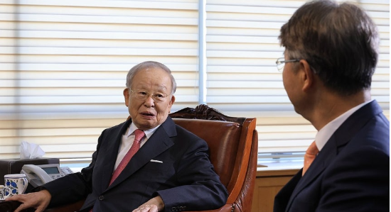 손경식 한국경영자총협회 회장(왼쪽)이 11일 서울 마포구 경총회관에서 김지형 경제사회노동위원회 위원장과 만나 대화하고 있다. (사진=연합뉴스) |