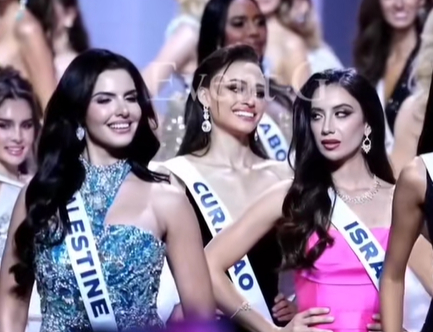 미스 유니버스 대회에서 공교롭게도 이스라엘 대표와 팔레스타인 대표가 나란히 서게 됐는데, 이때 이스라엘 대표가 팔레스타인 대표를 노려보는 듯한 모습이 포착돼 논란이 일고 있습니다.
