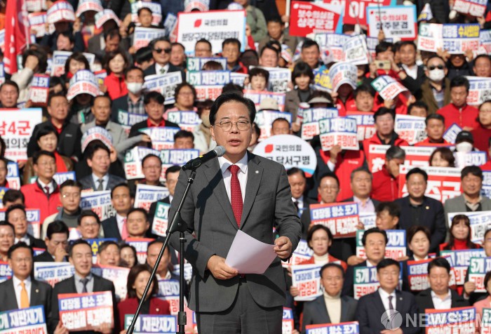 [서울=뉴스핌] 윤창빈 기자 = 송언석 국민의힘 원내대표가 12일 서울 여의도 국회 본관 계단에서 열린 대장동 일당 7400억 국고 환수 촉구 및 검찰 항소포기 외압 규탄대회에서 규탄사를 하고 있다. 2025.11.12 pangbin@newspim.com