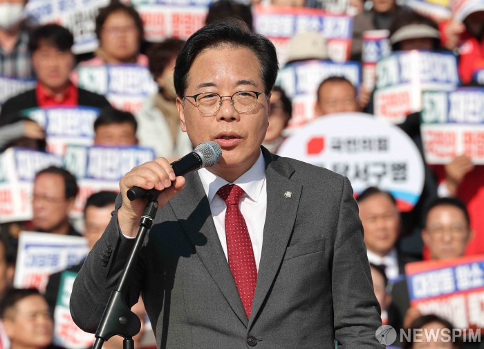 [서울=뉴스핌] 윤창빈 기자 = 송언석 국민의힘 원내대표가 12일 서울 여의도 국회 본관 계단에서 열린 대장동 일당 7400억 국고 환수 촉구 및 검찰 항소포기 외압 규탄대회에서 규탄사를 하고 있다. 2025.11.12 pangbin@newspim.com