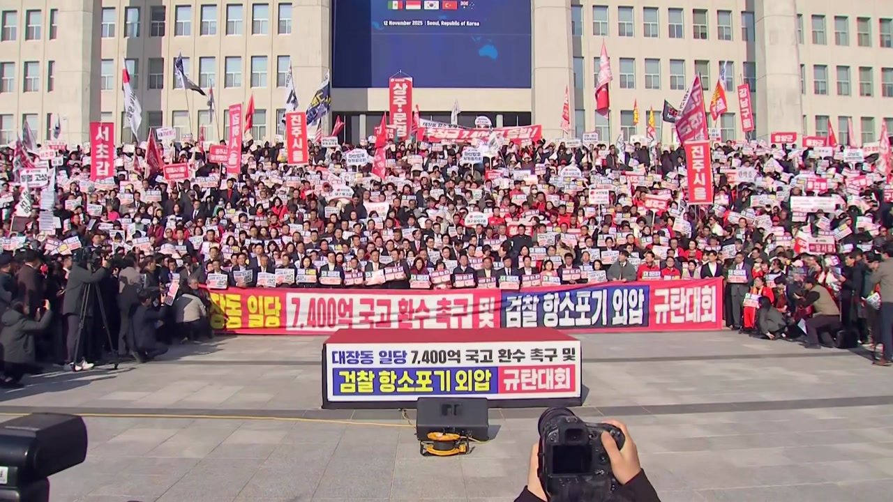 국민의힘이 '대장동 일당 7,400억 원 국고 환수 촉구와 검찰 항소 포기 외압 규탄대회'를 열고 이재명 대통령 탄핵 날까지 뭉쳐서 싸우겠다며 특검과 국정조사 추진 의사를 거듭 밝혔습니다.