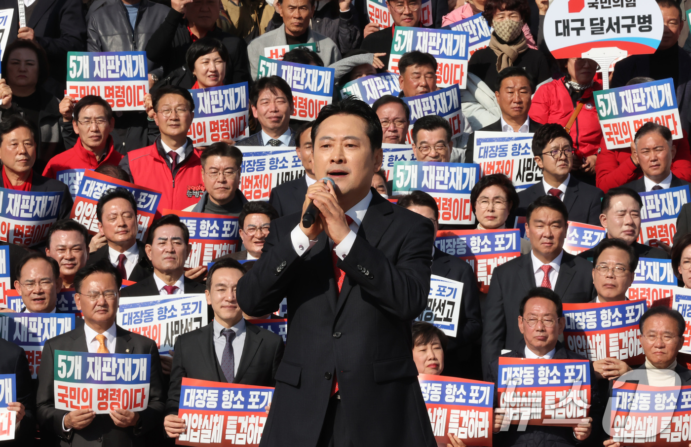 장동혁 국민의힘 대표가 12일 오전 서울 여의도 국회 본청 계단에서 대장동 일당 7400억 국고 환수 촉구 및 검찰 항소 포기 외압 규탄대회에서 발언하고 있다. 2025.11.12/뉴스1 ⓒ News1 장수영 기자 |