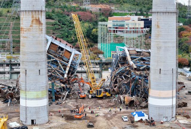 한국동서발전 울산화력발전소 붕괴 현장에서 구조 걸림돌로 지목된 보일러 타워 4·6호기 발파 후 수색 작업이 속도를 내고 있다. 지금까지 사망자 5명의 시신이 수습됐고, 위치가 확인된 사망 추정자 1명과 실종자 1명은 여전히 매몰 상태다.