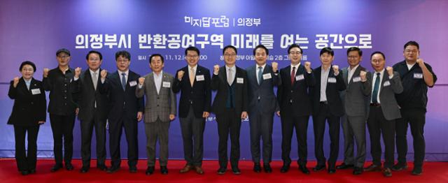 12일 경기 의정부시 아일랜드캐슬 그랜드볼룸에서 '반환공여구역 미래를 여는 공간으로'를 주제로 열린 미지답 포럼에서 이성철 한국일보 사장과 강현석 의정부시 부시장을 비롯한 주요 참석자들이 기념 촬영을 하고 있다. 왼쪽부터 박윤희 진보당 의정부시위원회 공동위원장, 최경호 미군반환공여지 시민참여위원회 집행위원장, 소성규 대진대 부총장, 백인길 대진대 교수, 김연균 의정부시의회 의장, 김대순 경기도 행정2부지사, 강 부시장, 이 사장, 김윤용 경기북부공론포럼 상임대표, 이정훈 대한지리학회 지리연구소장, 장윤배 경기연구원 선임연구위원, 강한구 입법정책연구원 국방혁신연구센터장, 이훈 신한대 교수. 하상윤 기자 |