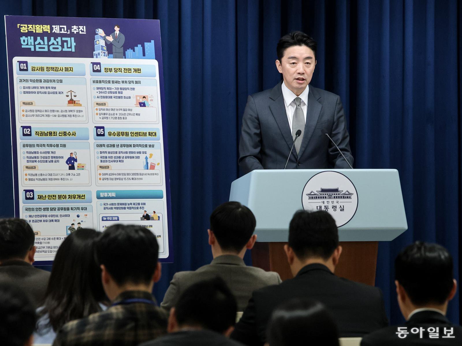 강훈식 대통령 비서실장이 12일 서울 용산 대통령실 청사에서 공직 활력 제고 추진 성과 및 공직 역량 강화 향후 계획 관련 브리핑을 하고 있다. 송은석 기자 silverstone@donga.com |