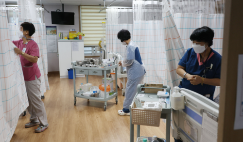 서울의 한 요양병원에서 간호사와 간병인들이 환자들을 살펴보고 있다. [이승환 기자] |