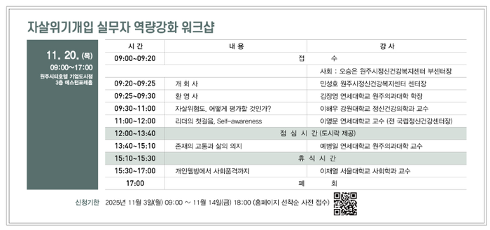 자세한 사항은 원주시자살예방센터(☎033-746-0198)로 문의하면 된다.