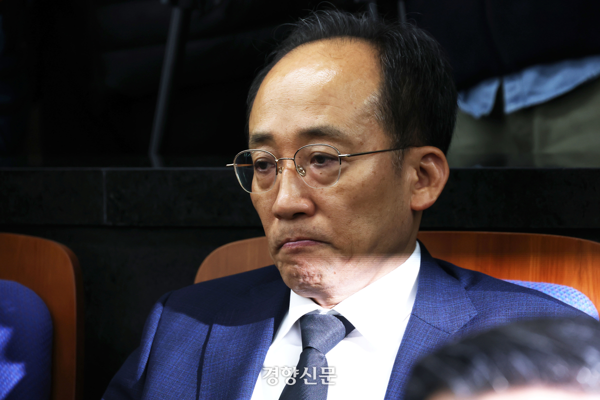 추경호 국민의힘 의원이 지난 4일 국회에서 열린 국민의힘 의원총회에 심각한 표정으로 앉아 있다. 한수빈 기자 |