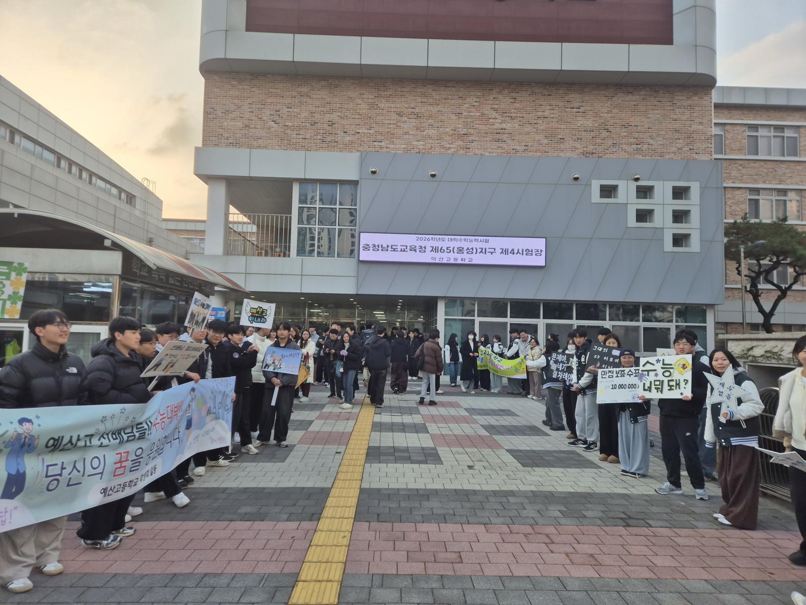 수능이 치러지는 13일 이른 아침부터 충남 예산 덕산고 시험장 앞에서 후배들의 플래카드 응원전을 펼치고 있다. ⓒ 뉴스1 |