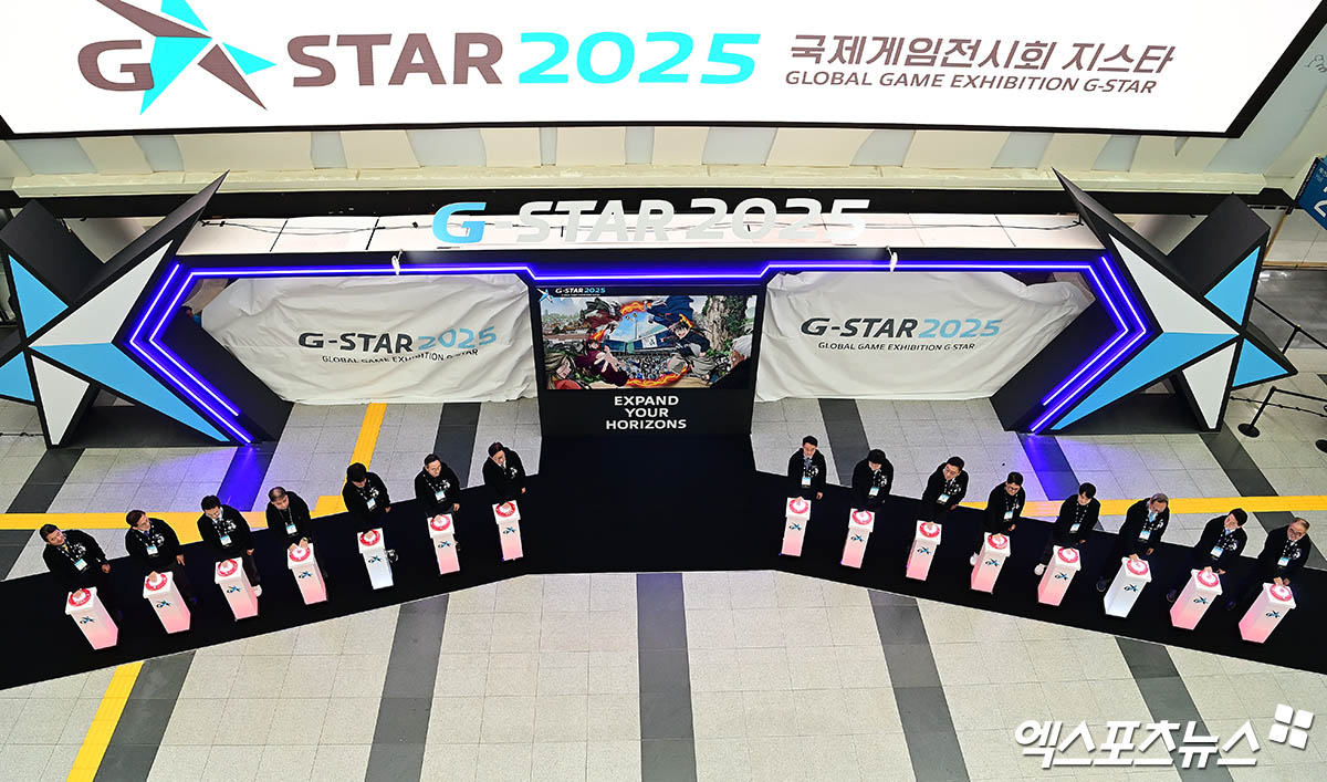 (엑스포츠뉴스 부산, 박지영 기자) 13일 부산광역시 우동 벡스코에서 열린 '지스타(G-STAR) 2025' 개막식에 참석한 내빈들이 인사하고 있다.