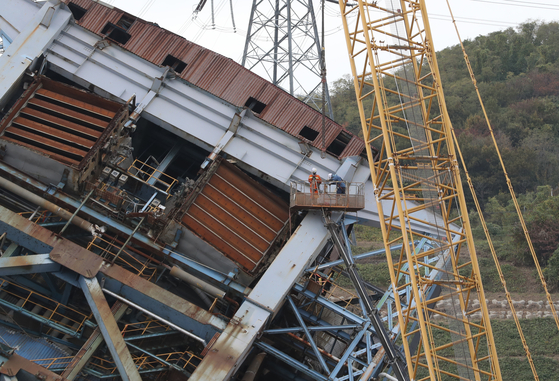 한국동서발전 울산화력발전소 보일러 타워 붕괴 사고 현장. 크레인으로 5호기 상부 구조물을 고정하는 작업이 이뤄지는 모습. 뉴스1 |