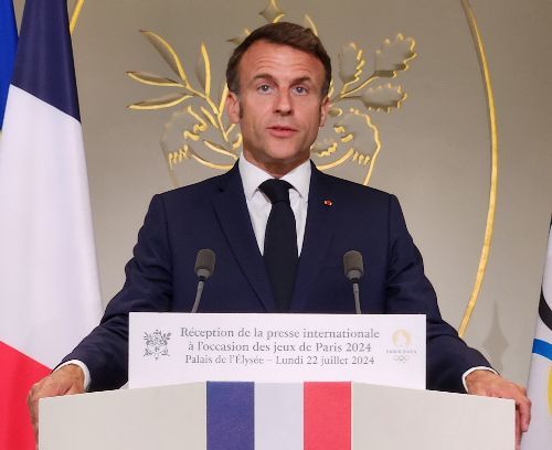 에마뉘엘 마크롱 프랑스 대통령이 2024년 파리 엘리제궁에서 열린 올림픽 외신기자 리셉션에서 발언하고 있다. 연합뉴스 |