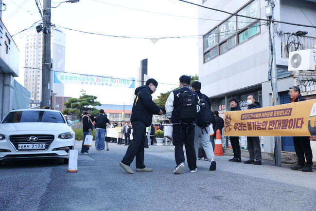 광주는 13일 수능 시험일 오전, 광주서석고등학교를 방문해 2025학년도 대학수학능력시험을 치르는 수험생들에게 응원의 메시지와 함께 직접 포장한 간식 꾸러미를 전달했다고 밝혔다.