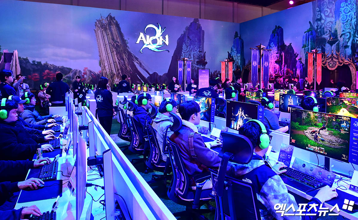 (엑스포츠뉴스 부산, 박지영 기자) 13일 부산광역시 우동 벡스코에서 열린 '지스타(G-STAR) 2025' 엔씨소프트 부스를 찾은 참관객들이 '아이온2' 게임 시연을 즐기고 있다.
