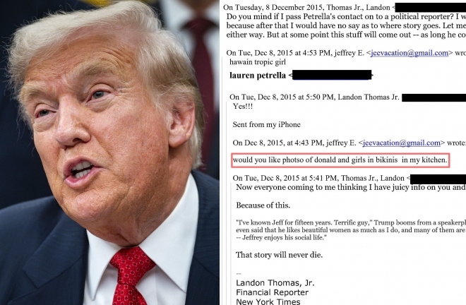 엡스타인은 2015년 토머스 랜던 뉴욕타임스 기자에게 “도널드와 비키니 차림 여성들이 내 주방에 있는 사진 줄까?”라고 보냈다.