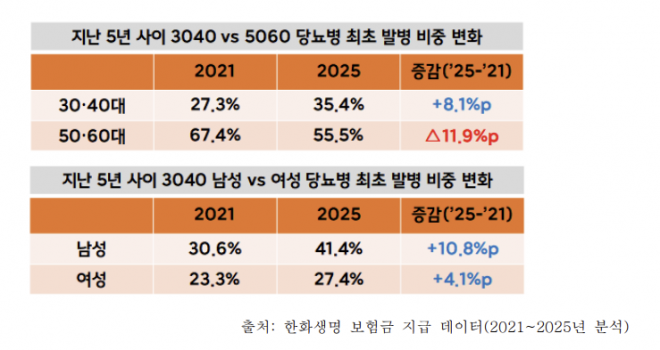 13일 한화생명이 최근 5년간 자사 보험금 지급 통계 36만 건을 분석한 결과, 당뇨로 실손보험금을 청구한 30·40대 비중은 2021년 27.3%에서 올해 35.4%로 8.1%포인트 확대됐다. 같은 기간 50·60대 청구 비중은 67.4%에서 55.5%로 줄어, ‘젊은 당뇨’ 확산 추세가 뚜렷했다.