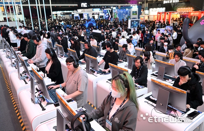 한국게임산업협회가 주최하고 지스타조직위원회, 부산정보산업진흥원이 주관한 국제게임전시회 지스타 2025가 13일 부산 해운대구 벡스코에서 열렸다. 넷마블 부스에서 관람객이 '몬길:스타다이브'를 체험하고 있다.