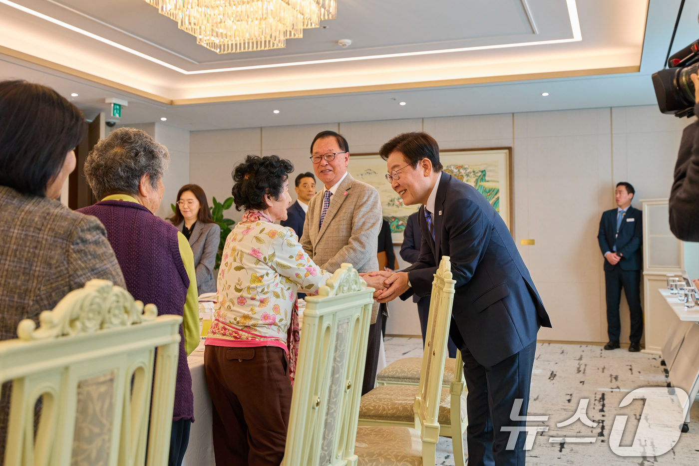 (서울=뉴스1) 허경 기자 = 이재명 대통령이 13일 서울 용산 대통령실 청사에서 열린 민주화실천가족운동협의회 초청 오찬 간담회에서 참석자들과 인사하고 있다. (대통령실 제공. 재판매 및 DB 금지) 2025.11.13/뉴스1