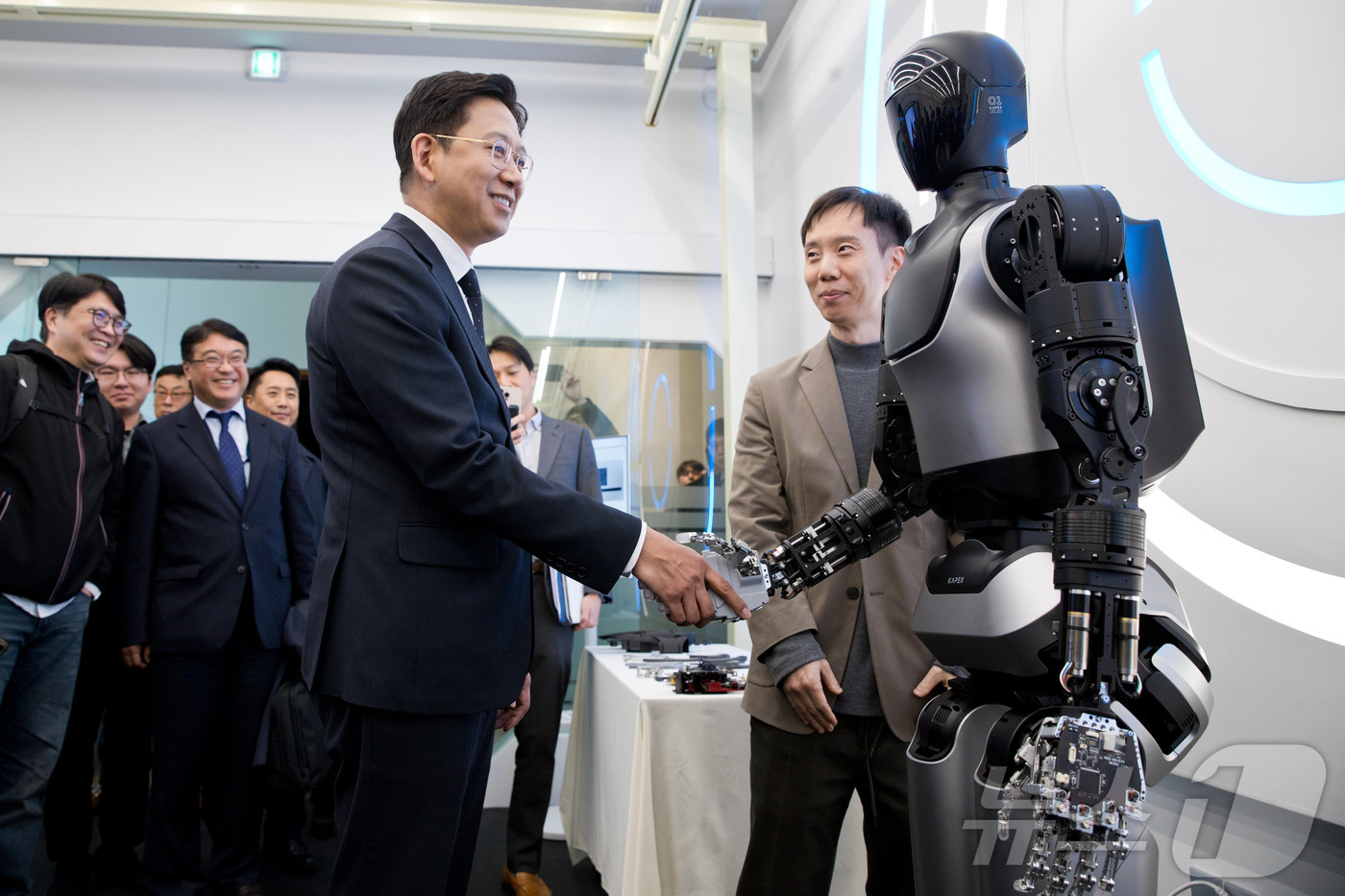(서울=뉴스1) = 배경훈 부총리 겸 과학기술정보통신부 장관이 13일 오후 서울 성북구 한국과학기술연구원(KIST)을 방문해 이종원 KIST 휴머노이드연구단장으로부터 AI 휴머노이드, 'KAPEX' 와 악수하고 있다. (과학기술정보통신부 제공. 재판매 및 DB 금지) 2025.11.13/뉴스1