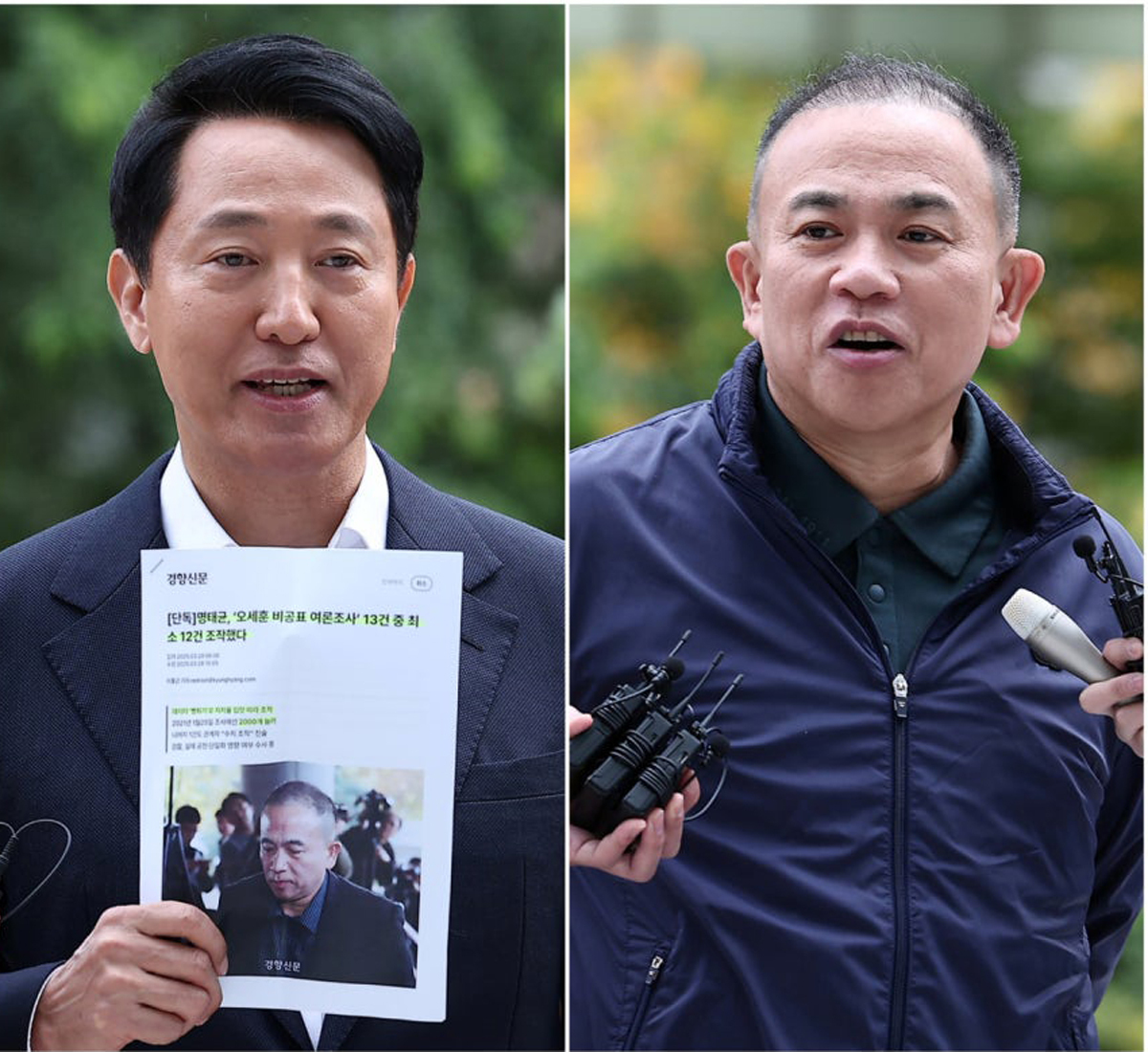 오세훈 서울시장(왼쪽)과 정치 브로커 명태균씨가 8일 서울 종로구 KT광화문빌딩에 마련된 김건희 특별검사팀 사무실에 조사를 받으러 출석하기 전 취재진에게 입장을 밝히고 있다. 뉴스1 |