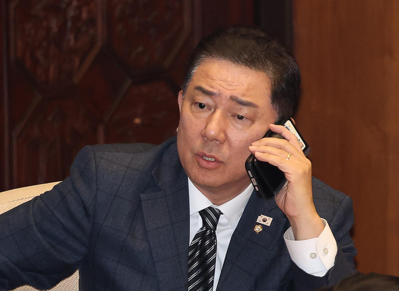 김병기 더불어민주당 원내대표가 13일 오후 서울 여의도 국회에서 열린 본회의에서 통화를 하고 있다. 2025.11.13 뉴시스 |