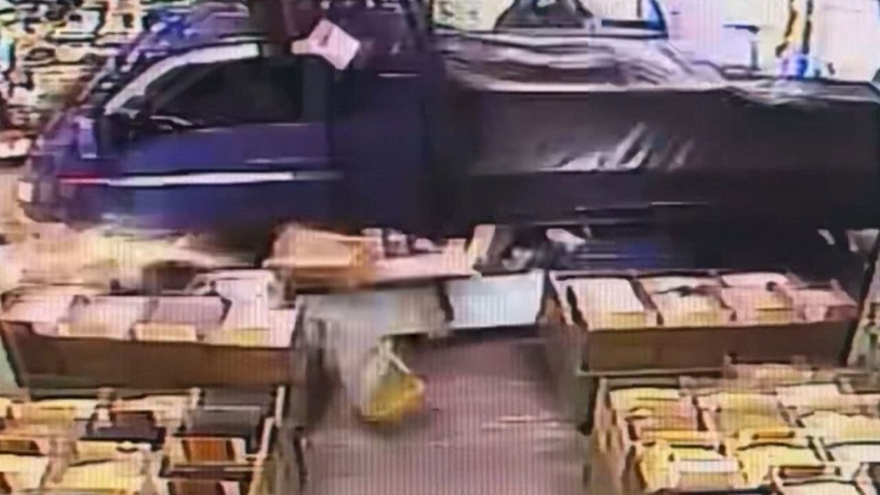 트럭이 앞뒤로 조금씩 움직이고 후진을 하더니 갑자기 시장 안으로 빠르게 돌진합니다.