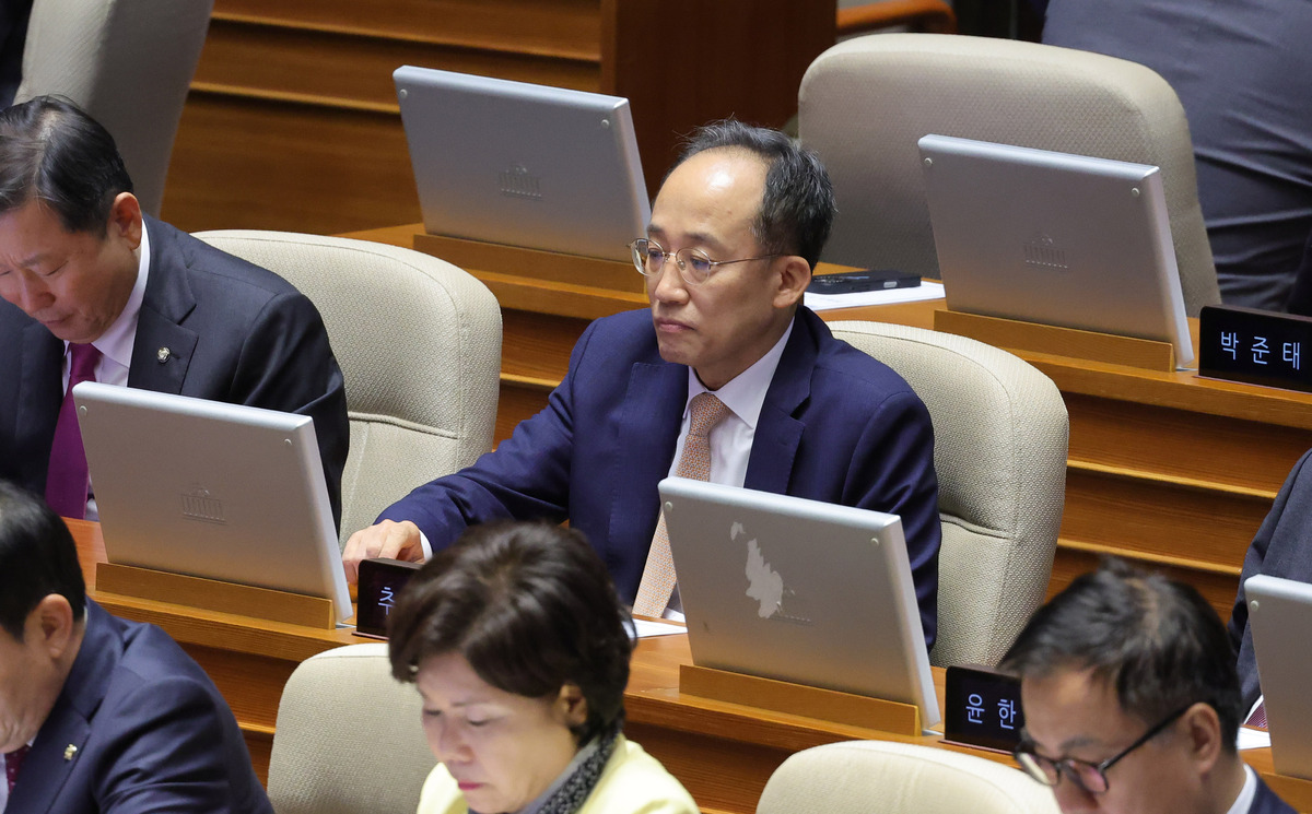 내란 중요임무 종사 등 혐의로 내란 특별검사팀이 구속영장을 청구한 국민의힘 추경호 의원이 13일 자신의 체포동의안 보고가 예정된 국회 본회의에 참석해 앉아 있다. 이재문 기자 |