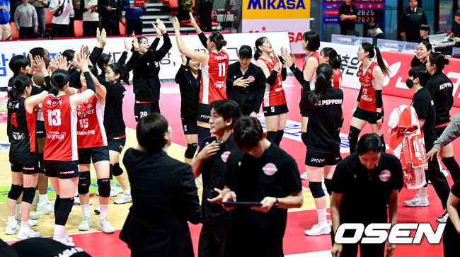 경기를 마치고 승리한 페퍼저축은행 선수들이 기뻐하고 있다. 2025.11.13 / dreamer@osen.co.kr