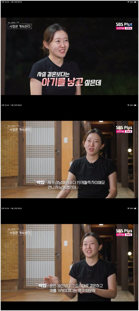 백합은 “저는 삼남매다. 언니, 남동생 이렇게 19개월 차다. 서로 노는 게 더 좋다. 그래서 노는 게 좋다. 그런데 결혼보다 아기를 낳고 싶다. 물론 혼전 임신보다 결혼 후 임신하는 게 맞는 일이라고 생각한다. 그래서 아이를 낳아야 하는데, 빨리 해야겠다는 생각했다”라며 이곳에 온 이유를 밝혔다./osen_jin0310@osen.co.kr