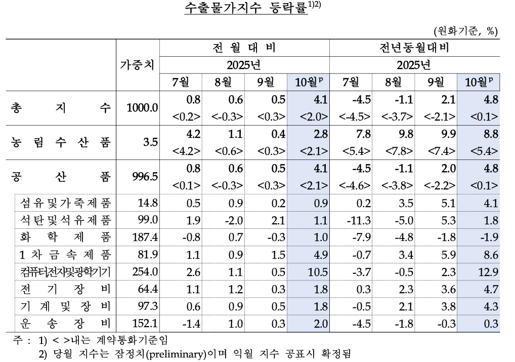 14일 한국은행 '2025년 10월 수출입물가지수 및 무역지수(잠정)'에 따르면 수출물가(원화 기준)는 전월보다 4.1%, 전년 동월보다 4.8% 상승했다.