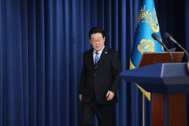 이재명 대통령이 14일 서울 용산 대통령실 기자회견장에 한미 팩트시트 타결 발표를 하기 위해 들어서고 있다. 왕태석 선임기자 |