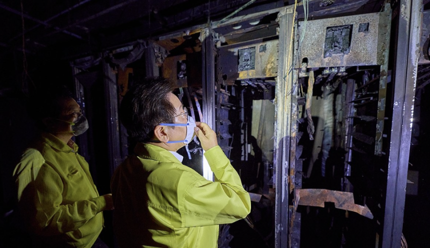 이재명 대통령이 지난달 10일 화재 피해 복구작업이 진행 중인 대전 유성구 국가정보자원관리원 대전 본원을 찾아 화재 발생 현장을 살펴보고 있다. 대통령실 제공 |