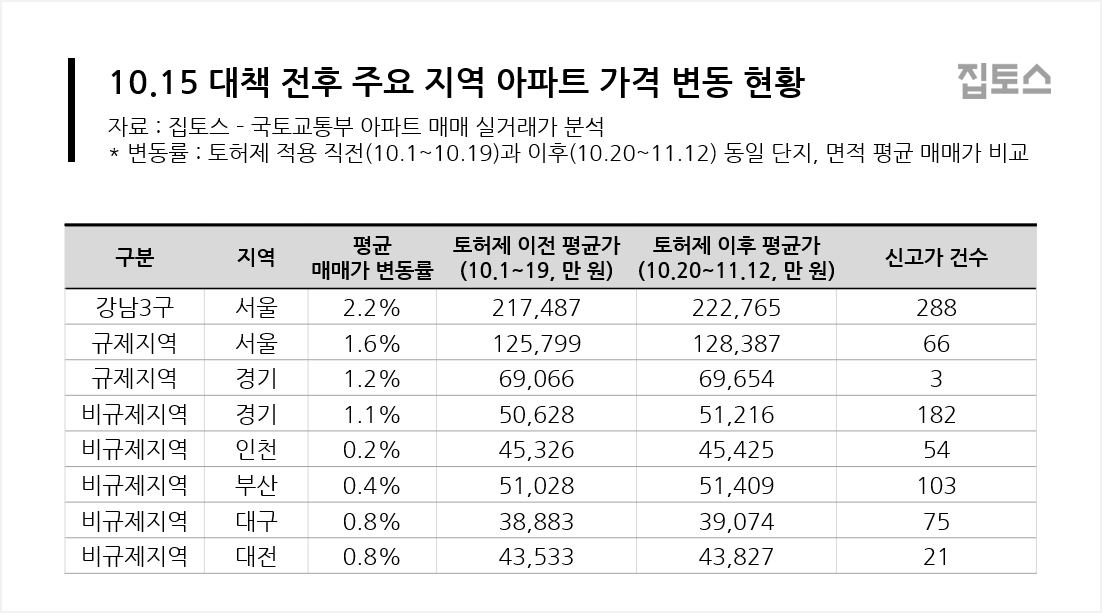14일 부동산 중개업체 집토스가 10·15 대책 시행 전후 국토교통부(국토부) 실거래가를 분석한 결과에 따르면 서울 신규 규제지역(강남3구 외)의 평균 매매가는 1.6%, 경기도 내 규제지역은 1.2% 오른 것으로 분석됐다.