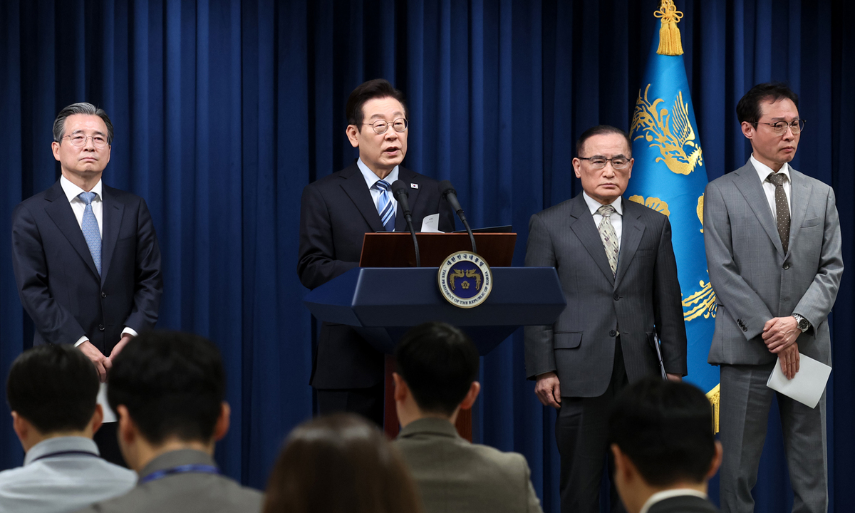 이재명 대통령이 14일 서울 용산 대통령실 기자회견장에서 한미 팩트시트 타결과 관련 발표를 하고 있다. 왼쪽부터 김용범 정책실장, 이재명 대통령, 위성락 국가안보실장. 이규연 홍보소통수석. 대통령실사진기자단 |