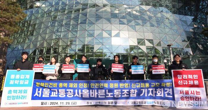 [서울=뉴스핌] 양윤모 기자 = 서울교통공사의 MZ 노조인 제3노조(올바른노동조합)가 29일 오전 서울시청 앞에서 지하철 파업에 관한 기자회견을 하고 있다. 올바른노조는 지난 21일부터 오는 24일까지 쟁의행위 찬반 투표를 실시하여 찬성률 91.2%로 파업을 가결시켰다. 2024.11.29 yym58@newspim.com |