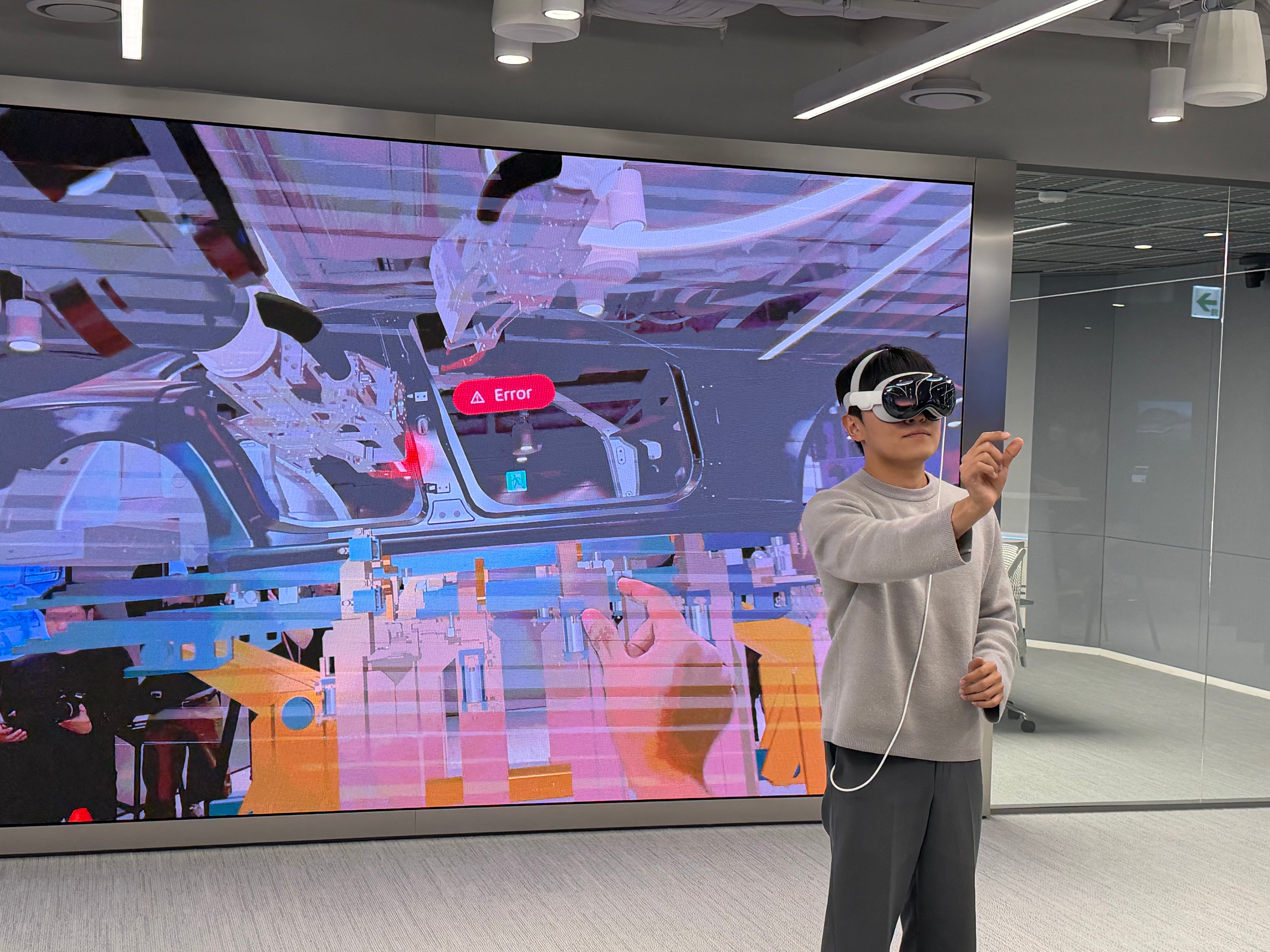 이날 시연에서는 비전 프로를 착용한 다쏘시스템 관계자의 눈 앞에 펼쳐진 장면을 대형 화면을 통해 보여줬다. 화면에는 자동차 설계 도면이나 공장 내부의 가상 모델이 등장했는데, 시연자는 손짓 만으로 제품의 배치를 바꾸거나 특정 기능을 공장 운영에 적용했다. 여러 사람이 원격으로도 동일한 가상 환경에서 동시에 작업하는 게 가능해 팀간 업무 협업에 도움이 될 것이라고 회사 측은 설명했다.