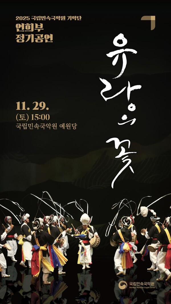 (문화뉴스 주민혜 기자) 국립민속국악원이 11월 29일 오후 3시, 예원당에서 연희부 정기공연 '유랑의 꽃'을 개최한다. 이번 무대에서는 전통 연희의 흥과 신명을 현대 무대미학과 결합해 새로운 작품으로 선보일 예정이다.