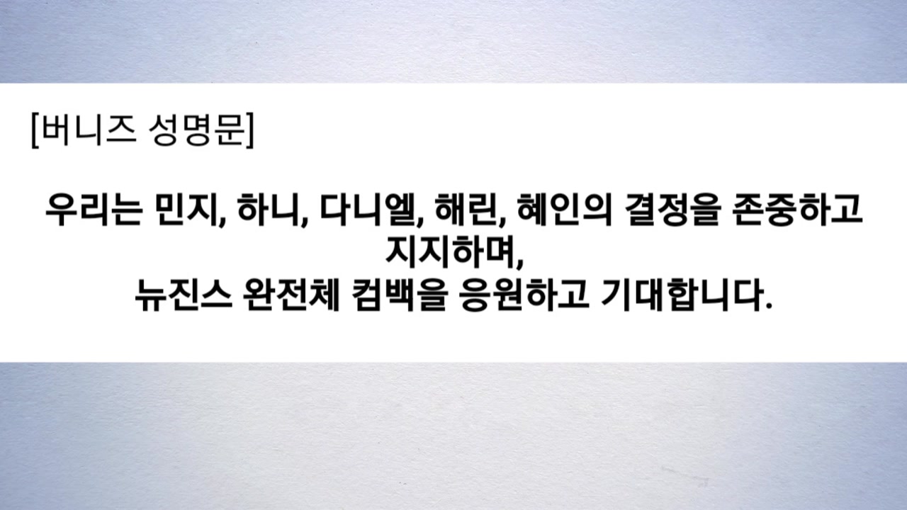 뉴진스 팬덤 '버니즈'는 지난 1년이 쉽지 않은 시간이었지만 이 과정이 의미가 없었다고 생각하지 않는다며, 연예기획사가 소속 연예인을 더 보호하고 존중할 수 있도록 관계가 재정립되기를 바란다고 밝혔습니다.
