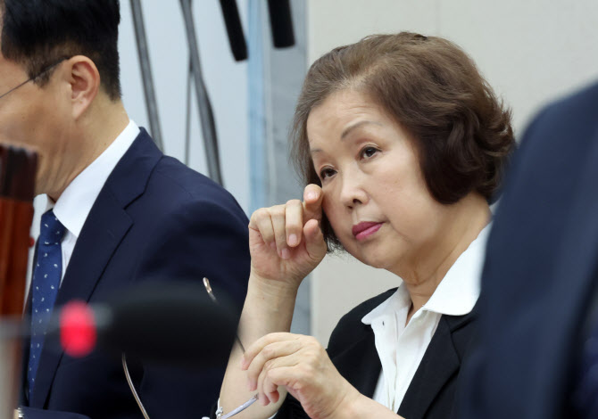 손효숙 리박스쿨 대표가 10일 서울 여의도 국회에서 열린 교육위원회의 리박스쿨 청문회에서 눈가를 만지고 있다. (사진=뉴시스) |