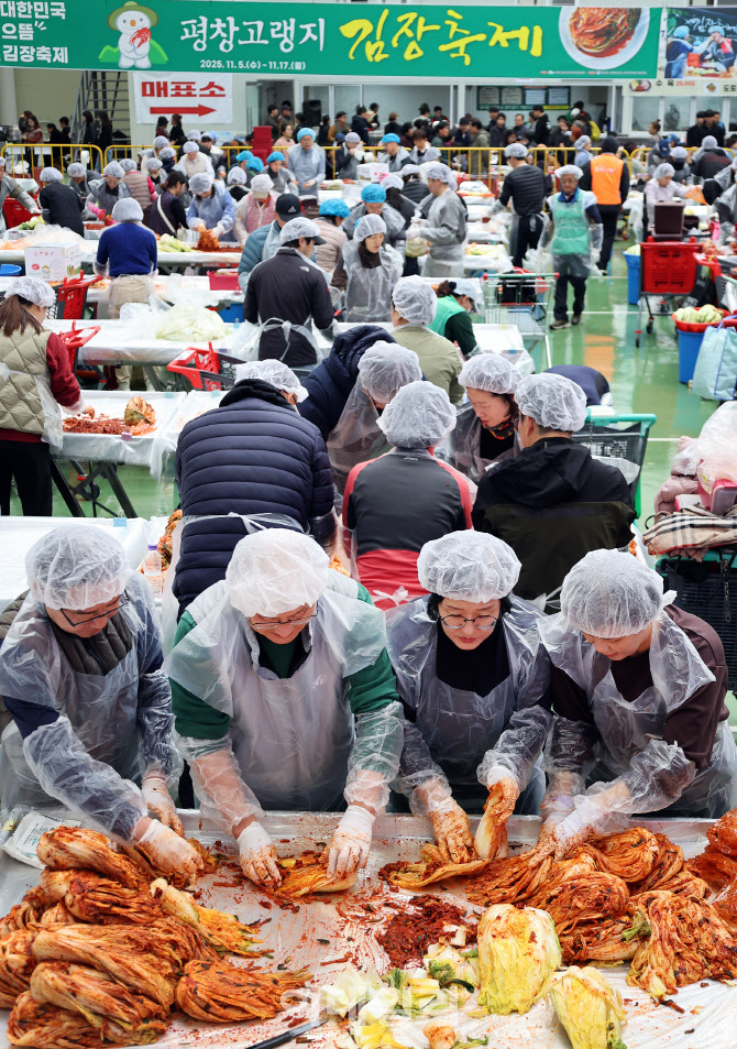 [이데일리 김태형 기자] 14일 강원 평창군 진부면민체육공원에서 개막한 제8회 평창고랭지김장축제에 평일임에도 많은 방문객들이 몰려 김장을 담그고 있다.